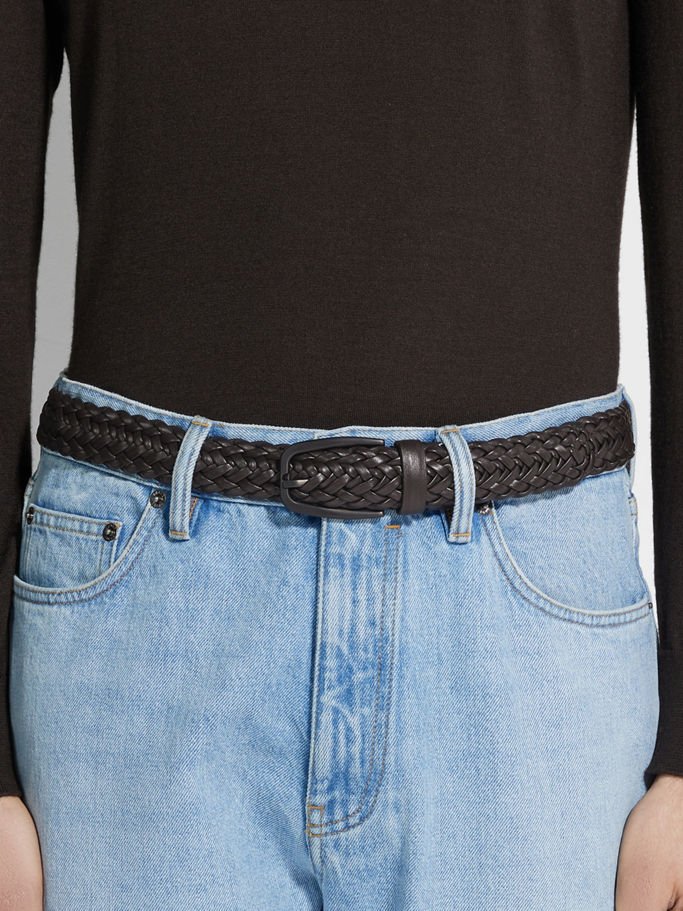A sophisticated, braided construction highlights the dark brown leather belt’s supple material. The fine cow leather is set off with a metal buckle featuring a black, brushed finish for an ultra-modern twist.