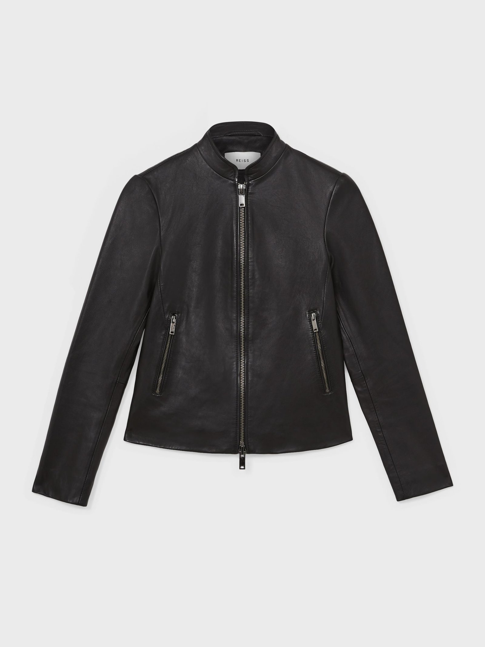 Sleek in silhouette with a collarless neckline, the black Allie leather jacket is a modern riff on a wardrobe hero. It’s designed from a butter-soft leather and is fully lined for comfort. A double-ended zip lends any off-duty edit a tough-luxe edge.